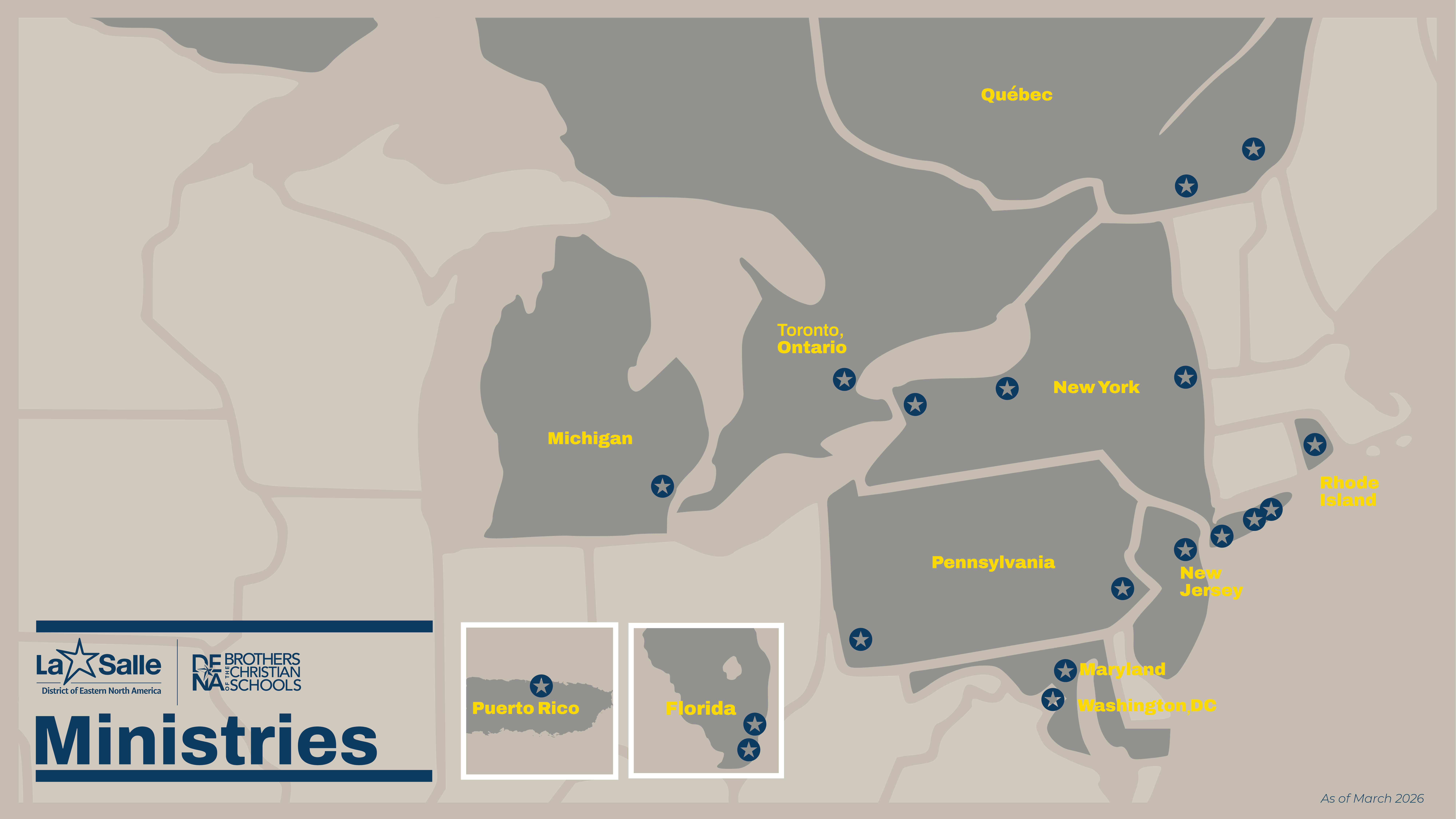 The District of Eastern North America (DENA) unites around 200 Brothers of the Christian Schools and 5,000+ partners in a mission spanning 31 ministries across the northeastern US and Toronto, Canada —including the Quebec Sector—and Puerto Rico.